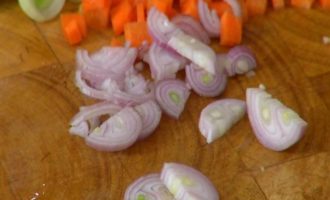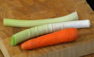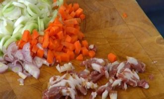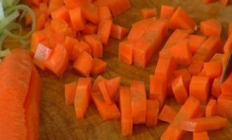 Стебель сельдерея и морковь порезать маленькими кубиками.