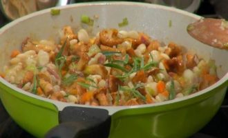 Добавить готовую фасоль, влить уксус, посолить, поперчить и дать лишней жидкости выпариться.
