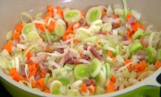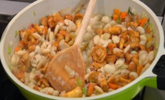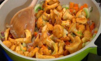 Лисички выложить к овощам с салом, слегка посолить и поперчить, перемешать и обжаривать до готовности овощей.