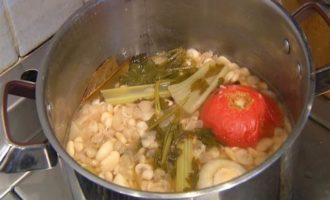 Фасоль замочить на ночь в воде, утром залить свежей водой, добавить помидор, стебель сельдерея с зеленью, очищенный лук и чеснок, лавровый лист и отварить до готовности, затем остудить и слить жидкость.