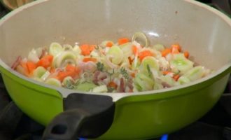 Мелко порубить 3-4 листика шалфея, добавить в сковороду, перемешать и обжаривать все 3-5 минут.