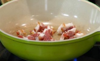 Разогреть в сковороде оливковое масло и обжаривать сало пару минут.
