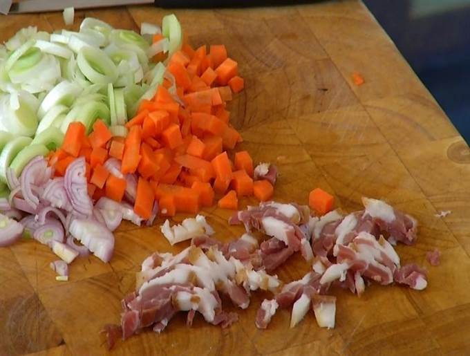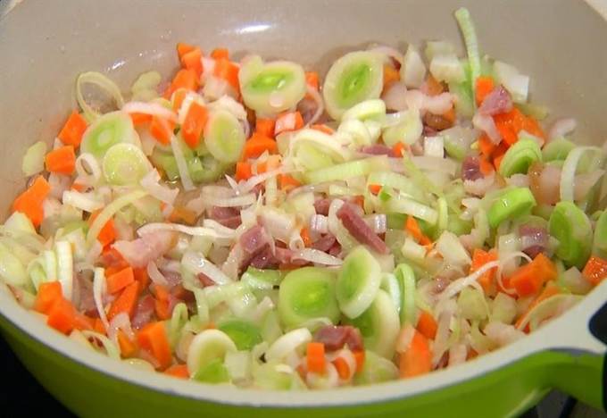 Разогреть в сковороде оливковое масло и обжаривать сало пару минут.