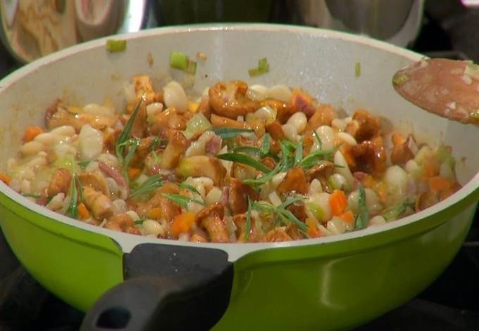 Снять сковороду с огня, добавить листья тархуна, влить оливковое масло Extra Virgin и перемешать.