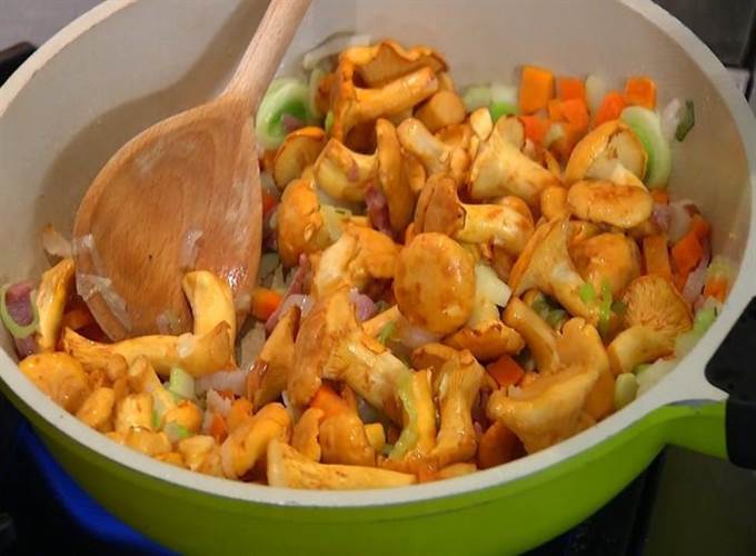 Лисички выложить к овощам с салом, слегка посолить и поперчить, перемешать и обжаривать до готовности овощей.