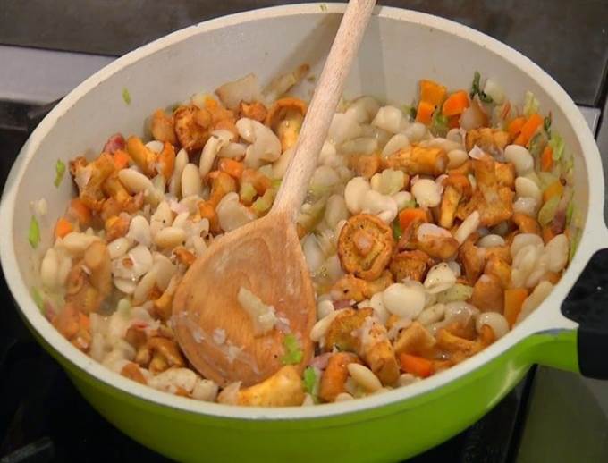 Добавить готовую фасоль, влить уксус, посолить, поперчить и дать лишней жидкости выпариться.