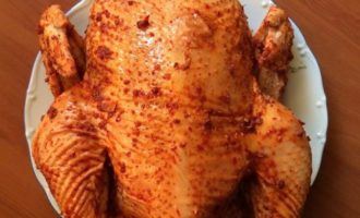 Пока дрова превращаются в угли, подготавливаем фазана — моем, сушим и щедро, не торопясь натираем его аджикой. Перец и соль использовать не стоит, так как аджика острая и достаточно соленая, а излишняя соль не позволит мясу фазана остаться сочным и нежным.