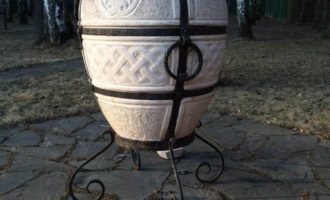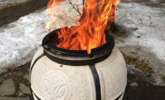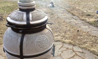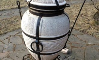Дрова в тандыре прогорели и он стал внутри белым. Помещаем наши заготовки на специальном кольце в тандыр, закрываем его крышкой и ставим таймер на 50 мин.