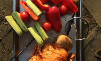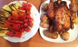 По прошествии времени поднимаем крышку тандыра и достаем шампуры с фазаном и овощами. Раскладываем на блюдо и начинаем пробовать, что у нас получилось.