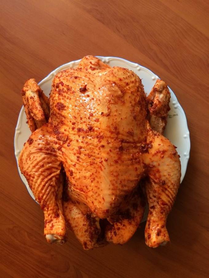 Пока дрова превращаются в угли, подготавливаем фазана — моем, сушим и щедро, не торопясь натираем его аджикой. Перец и соль использовать не стоит, так как аджика острая и достаточно соленая, а излишняя соль не позволит мясу фазана остаться сочным и нежным.