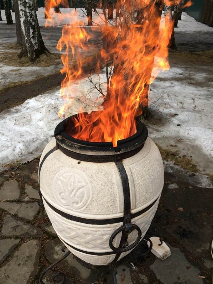 Дрова в тандыре прогорели и он стал внутри белым. Помещаем наши заготовки на специальном кольце в тандыр, закрываем его крышкой и ставим таймер на 50 мин.