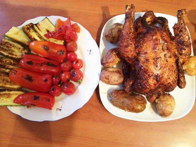 По прошествии времени поднимаем крышку тандыра и достаем шампуры с фазаном и овощами. Раскладываем на блюдо и начинаем пробовать, что у нас получилось.