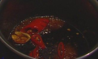 В небольшой сотейник влить соевый соус, 1 ст. ложку кунжутного масла, добавить сахар, чеснок и чили. Поставить сотейник на огонь и уваривать кунжутно-соевый соус, пока он не станет карамельным, затем процедить через сито.