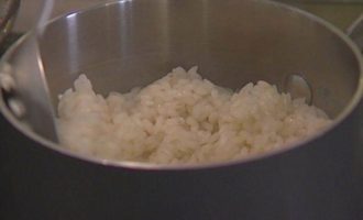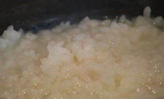 В отваренный рис влить рисовый уксус и 1/2 ч. ложки кунжутного масла, перемешать.