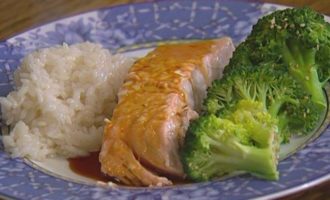 Выложить на тарелку рыбу, брокколи и рис. Полить все кунжутно-соевым соусом, посыпать оставшимся кунжутным семенем.