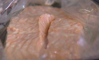 Семгу вымыть, обсушить салфеткой, затем поместить в рукав для запекания, скрепить концы рукава, уложить на противень и отправить в разогретую духовку на 7-10 минут.