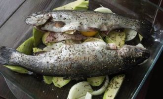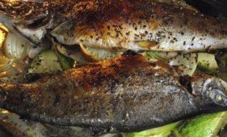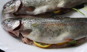 Периодически поливать соком. Запекаем до румяной корочки. Но, будьте осторожны, чтобы не пересушить нежное мясо рыбы. Через 15 минут проколоть вдоль хребта зубочисткой, если сок прозрачный — рыба готова! Время приготовления зависит от размера тушки форели.