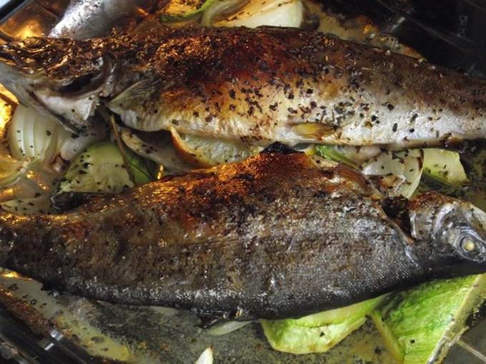Периодически поливать соком. Запекаем до румяной корочки. Но, будьте осторожны, чтобы не пересушить нежное мясо рыбы. Через 15 минут проколоть вдоль хребта зубочисткой, если сок прозрачный — рыба готова! Время приготовления зависит от размера тушки форели.