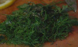 Петрушку и полпучка укропа мелко порубить, сбрызнуть 1 ст. ложкой оливкового масла, посолить, поперчить и перемешать.