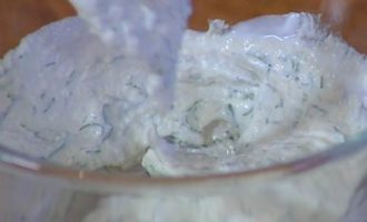 Приготовить соус: укроп мелко порубить, соединить со сметаной и хреном, все перемешать.