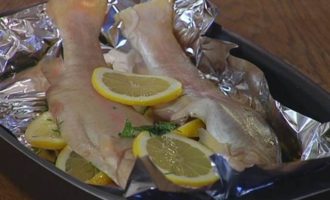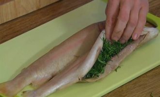 В брюшко каждой рыбы поместить измельченную зелень и несколько кружков лимона.