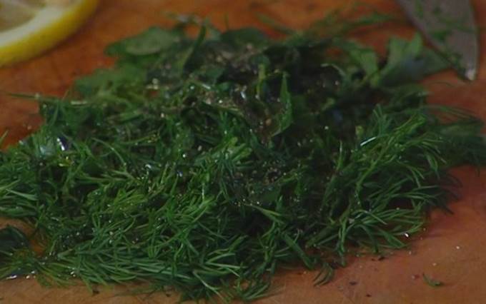 Петрушку и полпучка укропа мелко порубить, сбрызнуть 1 ст. ложкой оливкового масла, посолить, поперчить и перемешать.