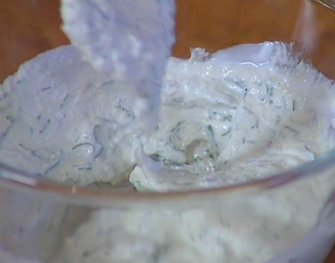 Приготовить соус: укроп мелко порубить, соединить со сметаной и хреном, все перемешать.