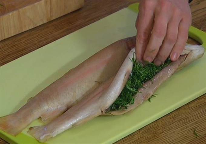 В брюшко каждой рыбы поместить измельченную зелень и несколько кружков лимона.