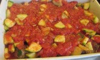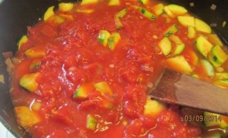 Доводим до кипения и добавляем помидоры в собственном соку. Готовим на среднем огне минут 5. Затем солим, перчим и добавляем мускатный орех.