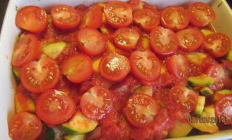 Помидорки черри разрезаем напопола и выкладываем сверху. Отправляем в духовку 200 гр минут на 30-40.
