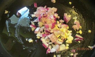 Теперь займемся овощами. Лук и чеснок мелко рубим и обжариваем на растительном масле до мягкости минут 5.