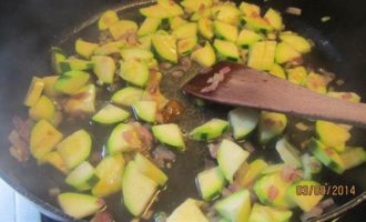 Цукини режем тонкими четвертинками и добавляем их в сотейник. Готовим несколько минут, после чего добавляем бульон (или воду).