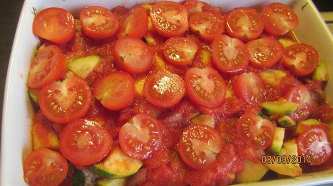 Помидорки черри разрезаем напопола и выкладываем сверху. Отправляем в духовку 200 гр минут на 30-40.