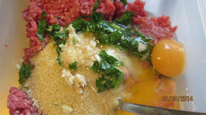 Смешиваем фарш, выдавленный чеснок (1 зубчик), яйца, панировочные сухари, петрушку, соль и перец по вкусу. Даем постоять минут 5.