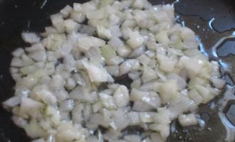 Лук мелко нарезать. Разогреть в сковороде оливковое масло и обжарить лук на слабом огне 15 минут, по необходимости подлить немного воды.
