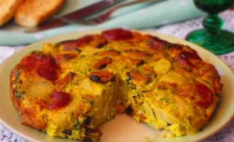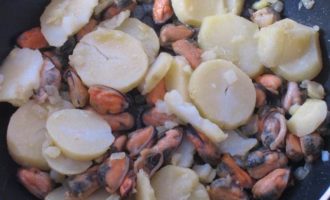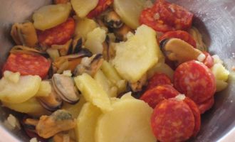 Добавить картофель, мидии и готовить несколько минут для объединения ароматов. Снять с огня, остудить.