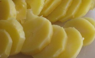 Картофель отварить в мундире до готовности, почистить и нарезать тонкими кружочками.