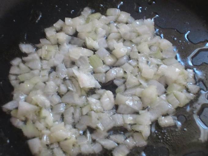 Лук мелко нарезать. Разогреть в сковороде оливковое масло и обжарить лук на слабом огне 15 минут, по необходимости подлить немного воды.