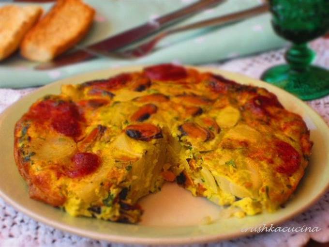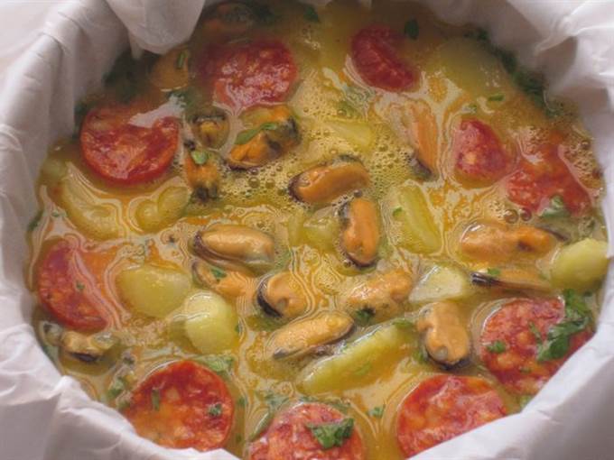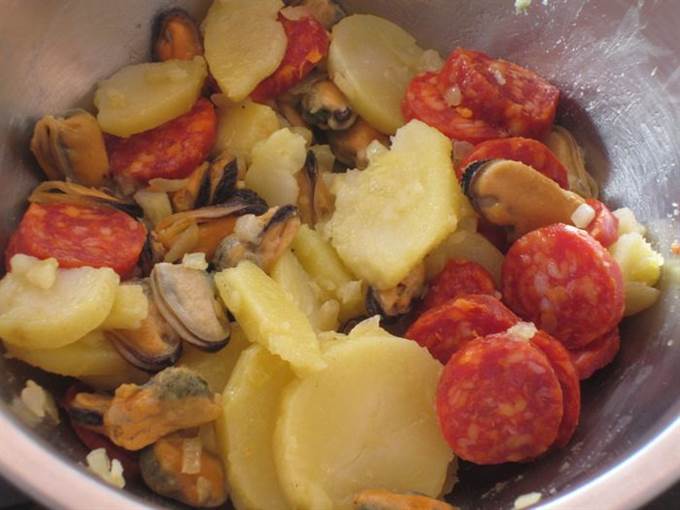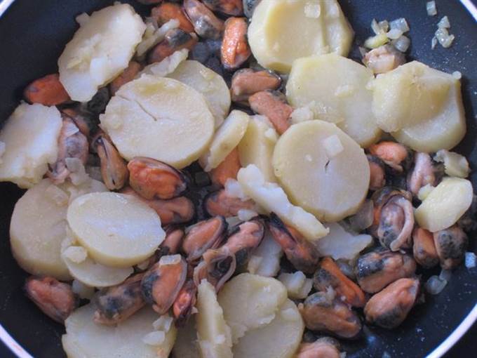 Добавить картофель, мидии и готовить несколько минут для объединения ароматов. Снять с огня, остудить.