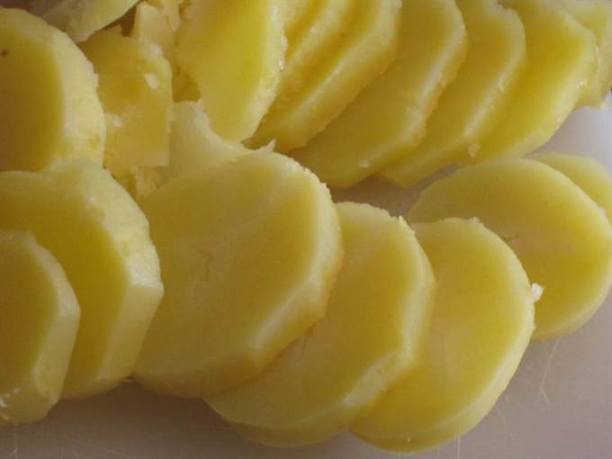 Картофель отварить в мундире до готовности, почистить и нарезать тонкими кружочками.