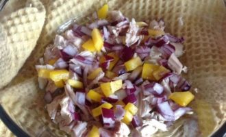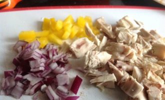 Духовку разогрейте до 180 градусов. Мелко порежьте лук, болгарский перец и остатки курицы.