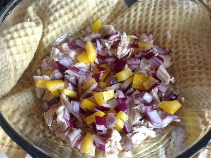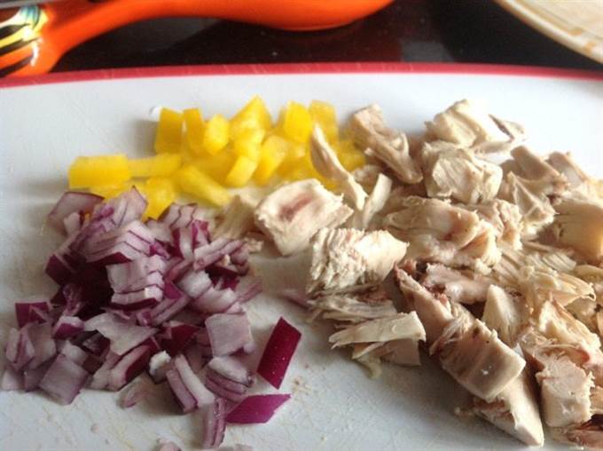 Духовку разогрейте до 180 градусов. Мелко порежьте лук, болгарский перец и остатки курицы.