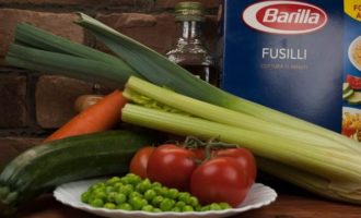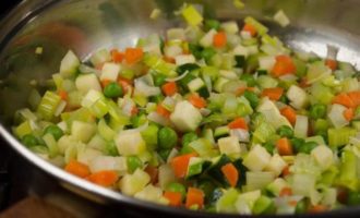 Поставить кастрюлю с оливковым маслом на средний огонь и выложить овощи. Готовить несколько минут до золотисто-коричневого цвета, а затем влить в кастрюлю горячий овощной отвар.