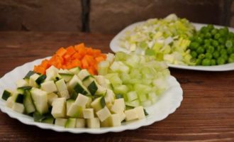 Горошек слегка бланшировать в соленой воде. Очистить все овощи (кроме помидоров) и нарезать мелкими кусочками.