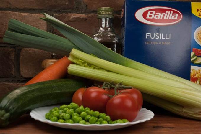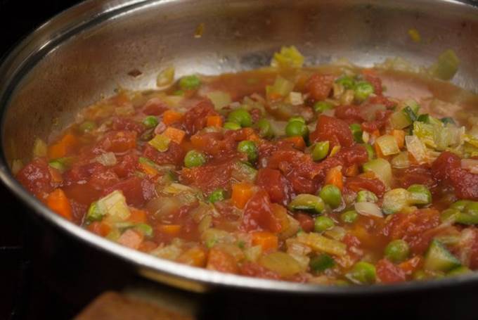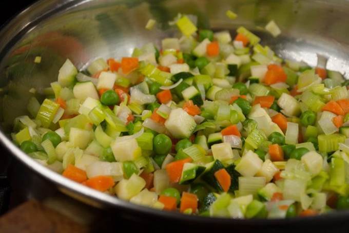 Поставить кастрюлю с оливковым маслом на средний огонь и выложить овощи. Готовить несколько минут до золотисто-коричневого цвета, а затем влить в кастрюлю горячий овощной отвар.