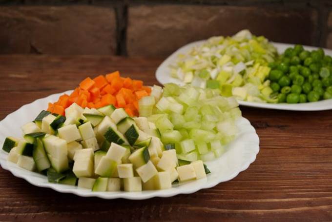 Горошек слегка бланшировать в соленой воде. Очистить все овощи (кроме помидоров) и нарезать мелкими кусочками.