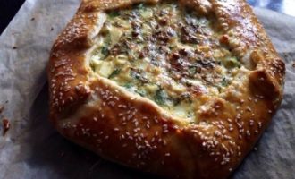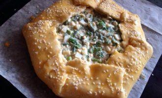 Загнуть края теста к центру. Смазать галету желтком, посыпать кунжутом.