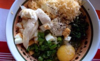 Вареные яйца (4 шт.) порезать кубиками, смешать с нарезанным зеленым луком, зеленью, тертым сыром (любой твердый) и крем-сыром.