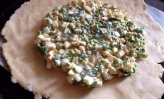Тесто раскатать толщиной 0,5 cм, в центр выложить начинку.