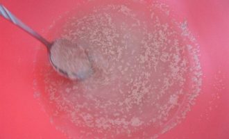 • В миску налейте теплой воды, добавьте сахар, дрожжи. Перемешайте и накройте полотенцем, оставьте на 15 минут.